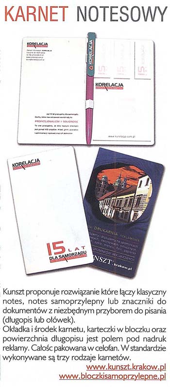 | Jedna z naszych realizacji autorskich zostało wyróżnione w Ogólnopolskim Konkursie Kalendarzy w 2005 roku. Projekt, koncepcja i realizacja - PUH KUNSZT, zakres prac introligatorskich - PUH KUNSZT, drukarnia cyfrowa - PUH KUNSZT, zdobienie (nadruk i tłoczenie) - PUH KUNSZT, akwarele - PUH KUNSZT. Do pracy wykorzystano skórę naturalną | |||